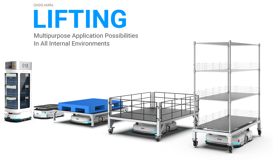 Lifting Application is common in shelf, cart, trolley, or pallet transportation for warehouseing, manufacturing, line feeding, and WIP FP transfer. In brief, the robot will stop beneath the carrier, lift it up, and transport to the designated destination.